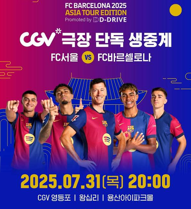 이번 FC서울 바르셀로나 친선경기는 극장에서도 생생하게 즐길 수 있도록 CGV가 단독 생중계를 진행합니다.